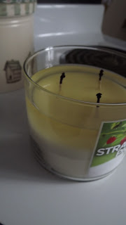 my thoughts cold -a clear glass of water holds a bunch of a strawberry plant in this picture for this creamy white candle. The picture could have been done better....strawberries are not harvested like flower bunches...at least none that I have seen....I would have rather seen them photographed sliced on a vanilla buttercream iced cupcake on a plate in the picnic basket.