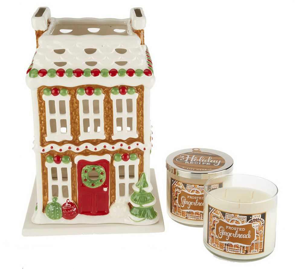 - Includes ceramic gingerbread luminary and two 14.5-oz candles in glass container